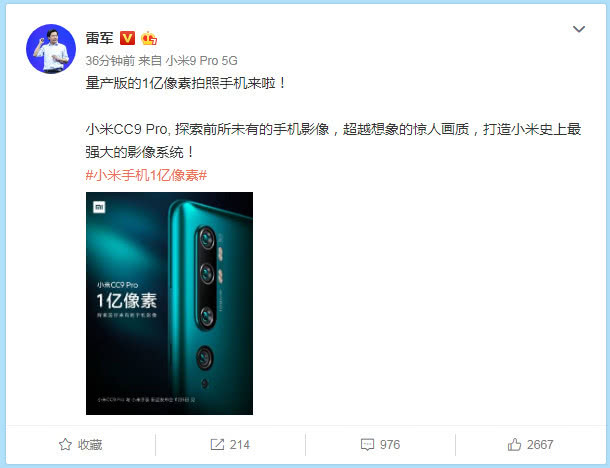 在環繞屏以後,小米又率先推出 1 億像素手機,將 1 億像素正式帶入量產時代。小米創始人雷軍表示,量產版的 1 億像素拍照手機小米 CC9 Pro,將打造小米史上最強大的影像系統。